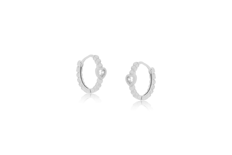 BRINCO EM PRATA, CORAÇÃO 10mm LARGURA, COM BANHO DE RÓDIO BRANCO, COLEÇÃO AURA