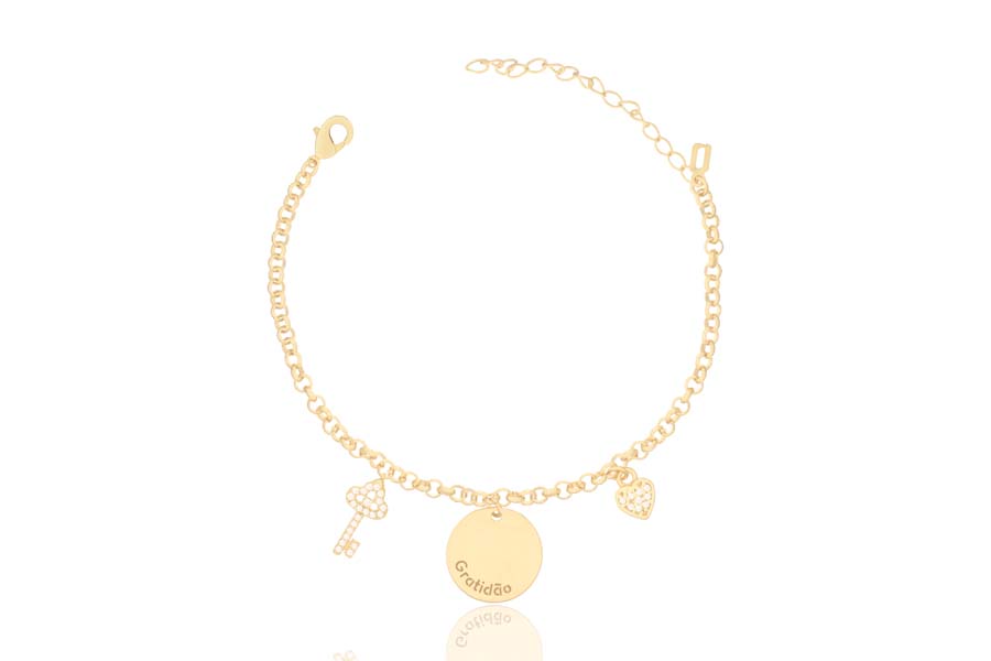 PULSEIRA INFANTIL BANHADA EM OURO, ELO DUPLO 1,80mm E CARTIER 3,50x1,90mm, 15cm COMPRIMENTO, CORAÇAO, ANJO E CHAVE