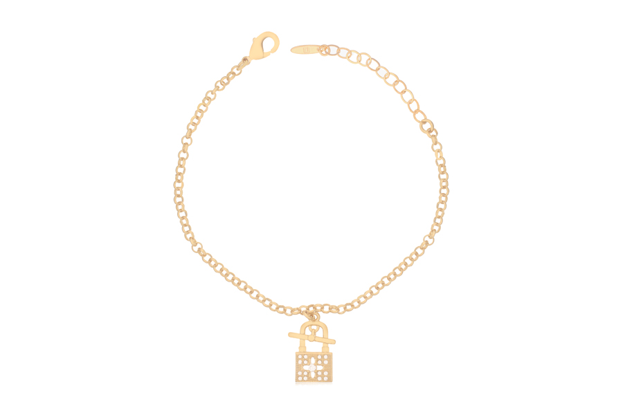 PULSEIRA INFANTIL BANHADA EM OURO, ELO 4,20x1,90mm, 14cm COMPRIMENTO, CHAVE, CADEADO E CORAÇÃO