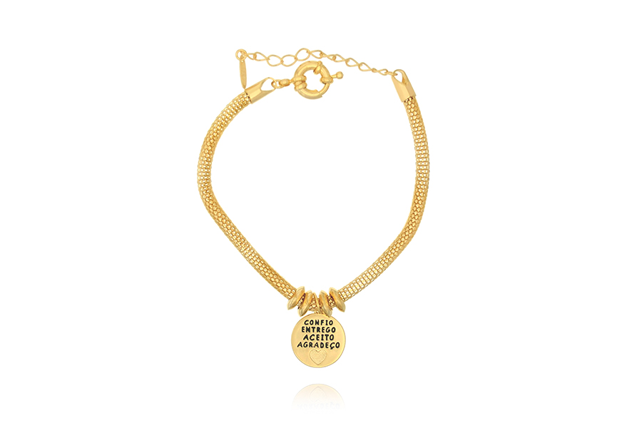 PULSEIRA BANHADA EM OURO, ELO PORTUGUÊS 2,50mm, 16cm COMPRIMENTO, PONTO DE LUZ 4,50mm E PINGENTE PAZ 11mm DIÂMETRO