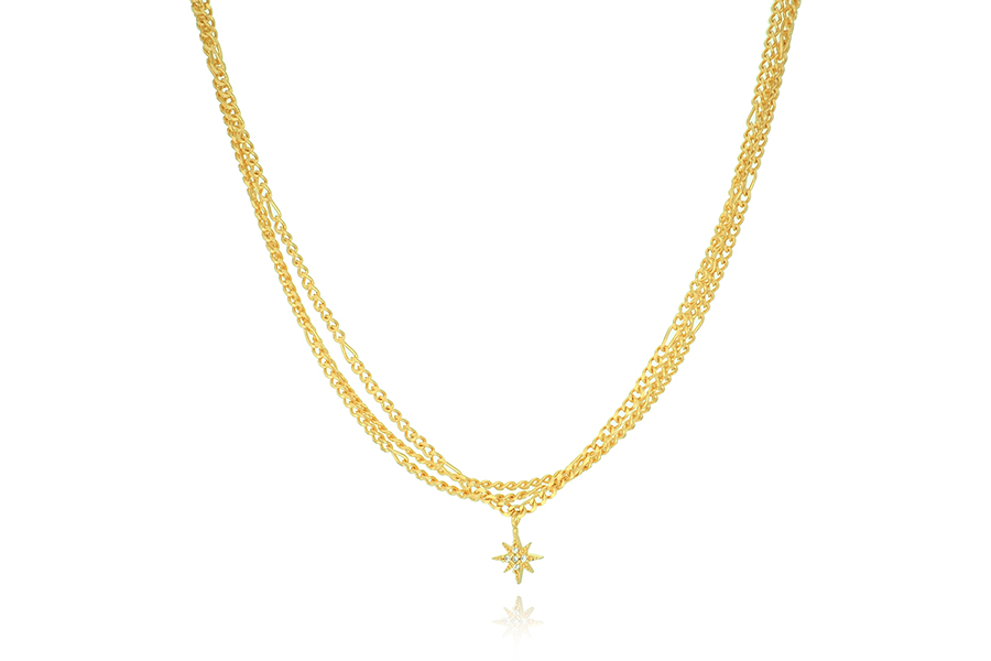GARGANTILHA BANHADA EM OURO, PONTO DE LUZ 4mm E OLHO GREGO 12mm DIÂMETRO, ELO VENEZIANA DUPLA 0,80mm