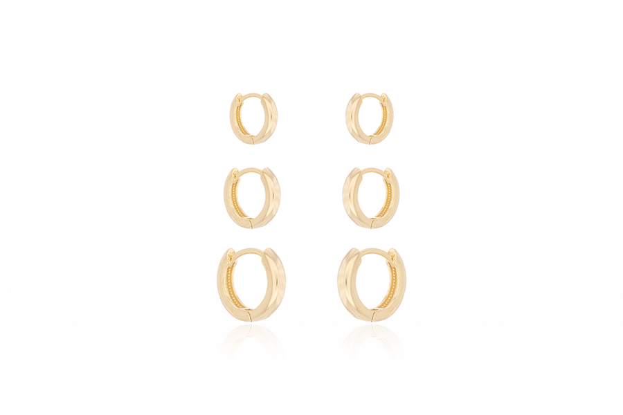 CONJUNTO BANHADO EM OURO TRIO DE BRINCOS DE ARGOLINHAS LISAS, 14, 13 E 12mm DIÂMETRO