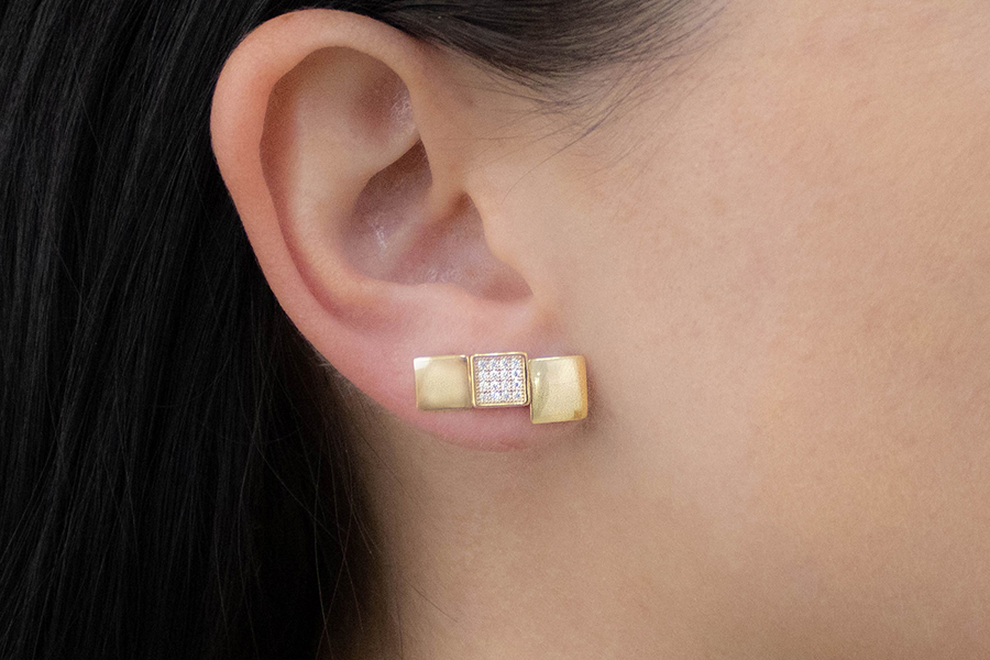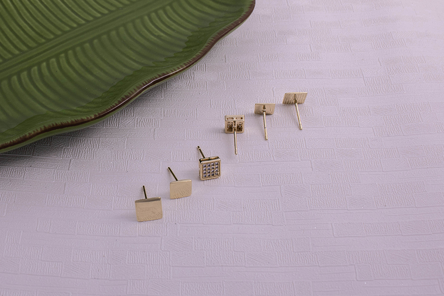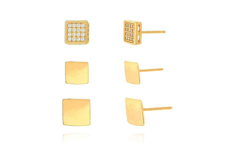 CONJUNTO BANHADO EM OURO, TRIO DE BRINCOS QUADRADO 7mm COM ZIRÔNIA, LISO 8mm E LISO 6,50mm