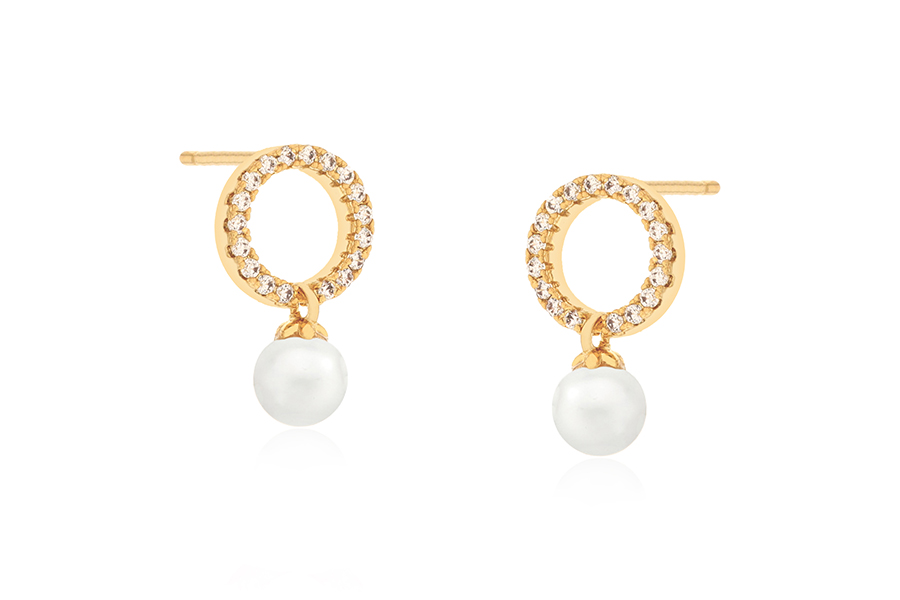 BRINCO BANHADO EM OURO, JP 14X7mm, PÉROLA SHELL 14mm E ZIRCÔNIAS, COLEÇÃO ESSÊNCIA
