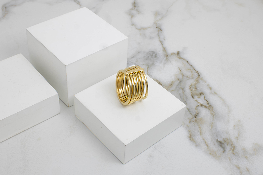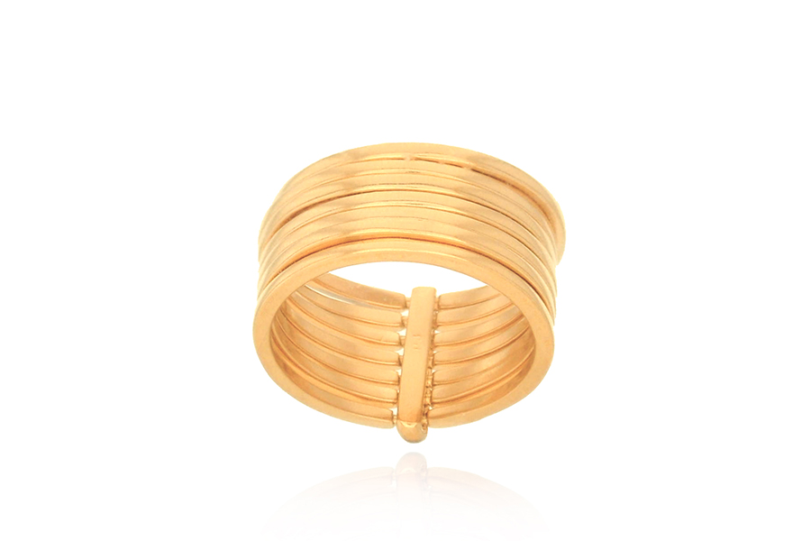 ANEL BANHADO EM OURO, 5 FIOS CRAVEJADOS COM FIOS LISOS EM ESPIRAL INTERNOS, 20mm LARGURA