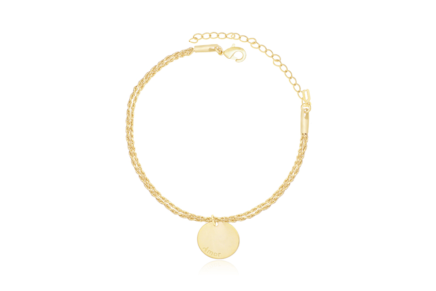 PULSEIRA BANHADA EM OURO, ELO PORTUGUÊS 2,50mm DIÂMETRO, 16cm COMPRIMENTO E CORAÇÃO 10mm LARGURA I LOVE MUSIC (EU AMO MÚSICA)